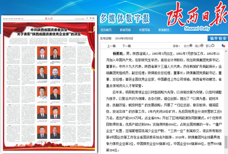 日前,陜西省國(guó)資委黨委發(fā)布了《關(guān)于表彰“陜西省國(guó)資委優(yōu)秀企業(yè)家”的決定》,陜煤集團(tuán)黨委書(shū)記、董事長(zhǎng)楊照乾被授予“陜西省國(guó)資委優(yōu)秀企業(yè)家”榮譽(yù)稱(chēng)號(hào)。近年來(lái),楊照乾帶領(lǐng)陜煤集團(tuán)以轉(zhuǎn)型戰(zhàn)略為先導(dǎo),以體制改革為突破,以結(jié)構(gòu)調(diào)整為抓手,以聚合共識(shí)為保障,去雜歸核,錯(cuò)位創(chuàng)新。提出了“以煤為基、能材并進(jìn)、技融雙驅(qū)、蛻變轉(zhuǎn)型”的發(fā)展戰(zhàn)略;開(kāi)展了“歸位總部、做實(shí)板塊、精簡(jiǎn)層級(jí)、放活實(shí)體”的改革工作,1年內(nèi)關(guān)閉18處礦井,先后異地易業(yè)分流安置職工近5萬(wàn)名,退出產(chǎn)能1815萬(wàn)噸,占全省62%;開(kāi)創(chuàng)了區(qū)域間能源協(xié)同新模式,6個(gè)優(yōu)勢(shì)項(xiàng)目取得核準(zhǔn),優(yōu)質(zhì)產(chǎn)能達(dá)到95%;實(shí)施債轉(zhuǎn)股454億,占到全國(guó)規(guī)模的一半;“僵尸企業(yè)”處置、壓縮管理層級(jí)減少企業(yè)戶(hù)數(shù)、“三供一業(yè)”剝離移交、混合所有制改革4項(xiàng)國(guó)企改革工作在全省國(guó)資委系統(tǒng)名列前茅。2018年,陜煤集團(tuán)列全球最具競(jìng)爭(zhēng)力煤炭企業(yè)第2位,中國(guó)煤炭企業(yè)50強(qiáng)第3位,中國(guó)企業(yè)500強(qiáng)第68位,世界500強(qiáng)第294位。楊照乾曾獲全國(guó)優(yōu)秀企業(yè)家、中國(guó)最佳上市公司領(lǐng)袖,陜西省勞動(dòng)模范、省重點(diǎn)領(lǐng)域頂尖人才等榮譽(yù)。