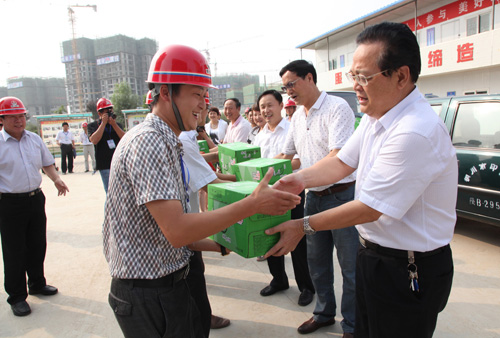 7月18日,馬富元一行在建設(shè)集團(tuán)總經(jīng)理張超暉,黨委副書(shū)記、紀(jì)委書(shū)記、工會(huì)主席楊永紅等人的陪同下,帶著綠茶、綠豆、酸梅粉、西瓜等防暑降溫慰問(wèn)品,深入建設(shè)集團(tuán)銅煤1#、2#工地,看望慰問(wèn)高溫下堅(jiān)守崗位的一線建設(shè)者,給他們送上夏日的一抹清涼。
