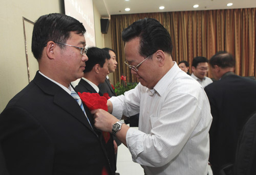 參加歡送儀式的集團公司領導為勞模佩戴光榮花