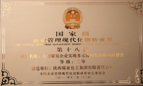 中國企業(yè)聯(lián)合會、國務院國資委企業(yè)改革局、工業(yè)和信息化部產(chǎn)業(yè)政策司和中小企業(yè)司于2012年3月24日在北京召開“2012年全國企業(yè)管理創(chuàng)新大會”。中國企業(yè)聯(lián)合會會長王忠禹、國資委副主任邵寧、工業(yè)和信息化部朱宏任總工程師等相關領導參加了會議。會議宣讀第十八屆國家級管理創(chuàng)新成果發(fā)布文件。陜西煤業(yè)化工集團公司《大型煤炭企業(yè)實現(xiàn)多元協(xié)同發(fā)展的重組整合》成果榮獲二等獎。