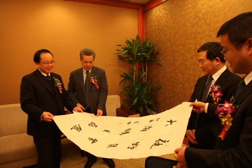 陜煤化集團(tuán)董事長(zhǎng)華煒(左二)、總經(jīng)理?xiàng)钫涨ㄗ笕┐砑瘓F(tuán)公司與大唐集團(tuán)互贈(zèng)禮物