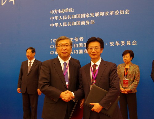 11月26日,由中國(guó)國(guó)家發(fā)展改革委、商務(wù)部和日本經(jīng)濟(jì)產(chǎn)業(yè)省、日中經(jīng)濟(jì)協(xié)會(huì)主辦的第六屆中日節(jié)能環(huán)保綜合論壇在北京舉行。會(huì)上,陜西煤業(yè)化工集團(tuán)公司與日本財(cái)團(tuán)法人煤炭能源中心(以下簡(jiǎn)稱“JCOAL”)舉行了關(guān)于低碳生態(tài)環(huán)保礦區(qū)(ECT)建設(shè)工作合作意向書的簽約儀式。陜西煤業(yè)化工集團(tuán)公司副總經(jīng)理尚建選、陜西煤業(yè)化工技術(shù)研究院副院長(zhǎng)王蘇健,JCOAL理事長(zhǎng)並木徹、理事竹川東明出席簽約儀式。尚建選與竹川東明分別代表雙方單位簽署了關(guān)于低碳生態(tài)環(huán)保礦區(qū)(ECT)建設(shè)工作合作意向書,并進(jìn)行了文本交換。