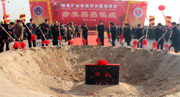 銅川礦業(yè)公司總經(jīng)理宋志剛宣布,“國家礦山救援銅川基地正式開工!”在震耳欲聾的鞭炮聲和喜慶的音樂聲中,各位領(lǐng)導(dǎo)揮锨鏟土為工程奠基。