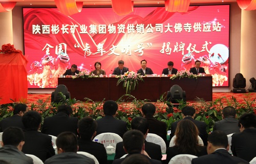 10月25日,彬長集團(tuán)在公司機(jī)關(guān)為榮獲2009—2010年度全國“青年文明號”的物資供銷公司大佛寺供應(yīng)站舉行了隆重的揭牌儀式。陜西煤業(yè)化工集團(tuán)公司黨委副書記、工會主席馬富元,黨委委員、彬長集團(tuán)執(zhí)行董事、黨委書記嚴(yán)廣勞,共青團(tuán)陜西省委組織部部長劉鋒,咸陽團(tuán)市委副書記林梅,集團(tuán)公司企業(yè)文化部部長、團(tuán)委副書記孫鵬,黃陵礦業(yè)公司、蒲白礦業(yè)公司、韓城礦業(yè)公司、澄合礦業(yè)公司、渭化集團(tuán)等單位團(tuán)委負(fù)責(zé)人,新華社陜西分社、《當(dāng)代礦工》雜志社、陜西工人報、咸陽日報、咸陽電視臺等新聞媒體應(yīng)邀出席。揭牌儀式由彬長礦業(yè)集團(tuán)黨委委員、工會主席慕生海主持。來自彬長集團(tuán)公司機(jī)關(guān)各部門、各二級單位的相關(guān)領(lǐng)導(dǎo)和共青團(tuán)組織負(fù)責(zé)人共計120余人參加了揭牌儀式。