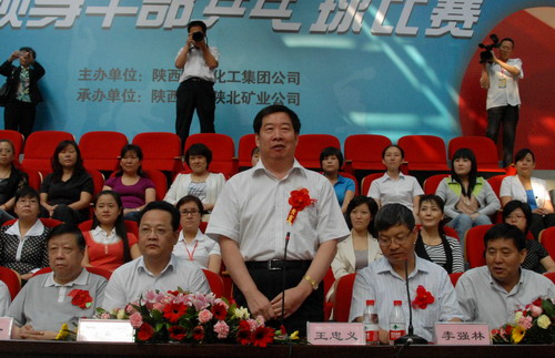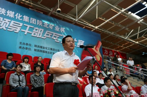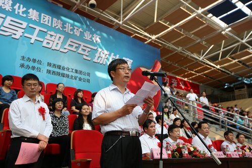 開幕式在雄壯的《中華人民共和國國歌》中開始。集團公司黨委副書記、工會主席馬富元致開幕詞。馬富元指出,剛剛過去的“十一五”,集團公司綜合實力顯著增強,產(chǎn)業(yè)體系日益完善,社會事業(yè)蓬勃發(fā)展,黨的建設深入推進,職工生活持續(xù)改善,幸福指數(shù)不斷提升,實現(xiàn)了“十一五”圓滿收官。尤其是2010年,集團公司煤炭產(chǎn)銷雙雙突破億噸大關,銷售收入561億元,利稅178億元,利潤105億元,成為陜西省企業(yè)第一。今年是集團“十二五”開局之年,上半年集團各項經(jīng)濟指標再創(chuàng)歷史新高,再次位居全省第一。其中,1-6月份煤炭生產(chǎn)5229萬噸,同比增長16.9%;化工產(chǎn)品301萬噸,同比增長62.7%;實現(xiàn)銷售收入336.82億元,利潤50.2億元,同比分別增長49.3%和94.2%。還先后完成了科技板塊、后勤板塊、水泥板塊的整合,產(chǎn)業(yè)多元化和運營專業(yè)化的格局逐步呈現(xiàn)。在我們致力推動經(jīng)濟社會又好又快發(fā)展的過程中,高度重視體育事業(yè)的全面發(fā)展,不斷滿足廣大干部職工日益增長的體育文化需求,全集團體育設施日益完善,全民健身運動蓬勃開展。這些成績的取得值得驕傲和自豪,凝聚著集團公司上下各級組織、各級領導、廣大職工的辛勤汗水和艱苦付出,也體現(xiàn)了集團公司上下各級領導干部引領企業(yè)發(fā)展的卓越領導力,也充分證明了集團公司上下的領導干部隊伍是一支能征善戰(zhàn)的強大團隊。今天,我們精心組織舉辦這次“陜北礦業(yè)杯”領導干部乒乓球比賽,目的就是通過開展有益身心的健身體育運動,進一步弘揚銳意進取、追求卓越的企業(yè)精神,倡導健康生活方式,推動全民健身運動的深入開展,展示陜煤化人的嶄新風貌,切實增強領導干部隊伍的凝聚力、向心力和戰(zhàn)斗力,激發(fā)各級領導干部昂揚的斗志、飽滿的熱情,為建設中國一流安全節(jié)能環(huán)保能源化工企業(yè)做出新的更大的貢獻。