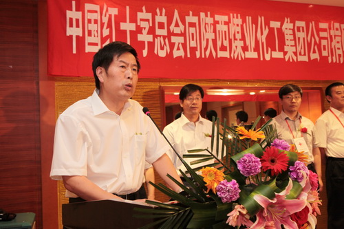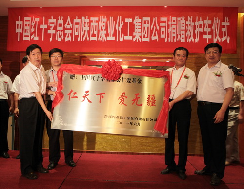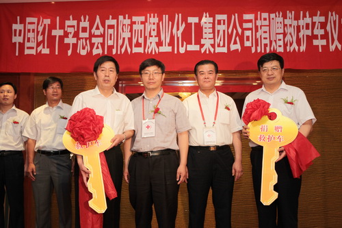 捐贈(zèng)儀式上,中國(guó)紅十字基金會(huì)仁愛(ài)基金志愿者工作辦主任時(shí)進(jìn)龍和陜西煤業(yè)化工實(shí)業(yè)集團(tuán)公司領(lǐng)導(dǎo)進(jìn)行了捐贈(zèng)救護(hù)車(chē)交接儀式。陜煤化集團(tuán)向中國(guó)紅十字基金會(huì)仁愛(ài)基金贈(zèng)送了“仁天下,愛(ài)無(wú)疆”牌匾。