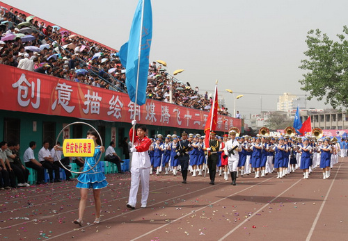 當(dāng)天上午,煤城銅川陽光燦爛,從銅川礦業(yè)公司機(jī)關(guān)辦公大樓到市體育場,處處洋溢著一派隆重、熱烈、喜慶的濃厚氛圍。鑼鼓喧天、軍樂陣陣、鮮花朵朵、彩旗飄揚(yáng),“熱烈慶祝銅川礦業(yè)公司(局)第二屆職工運(yùn)動會隆重舉行”等字樣的大紅彩門與催人奮進(jìn)的數(shù)幅標(biāo)語分外奪目。8時30分,來自礦業(yè)公司機(jī)關(guān)及基層30個單位的6000余名礦工運(yùn)動健兒滿懷無比喜悅的心情,組成一個個方陣,邁著矯健的步伐,從公司機(jī)關(guān)辦公大樓門前沿街依次有序走進(jìn)市體育場。9時10分,銅川礦業(yè)公司第二屆職工運(yùn)動會開幕式開始。裁判員、運(yùn)動員依序入場。在旗手的護(hù)衛(wèi)下,中華人民共和國國旗、陜西煤業(yè)化工集團(tuán)公司司旗和本屆運(yùn)動會會旗,伴隨著《中華人民共和國國歌》和《銅川礦務(wù)局局歌》樂曲聲莊嚴(yán)升起,高高飄揚(yáng)在銅川市體育場上空。