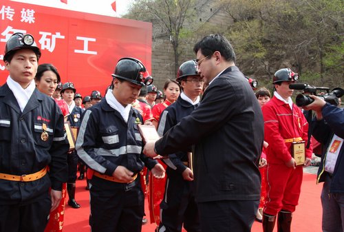 “我們倡議:把不斷學(xué)習(xí)作為一種精神追求,把不斷創(chuàng)新作為一個(gè)奮斗目標(biāo),把勤儉節(jié)約作為一種生活習(xí)慣,把安全生產(chǎn)作為一種自覺行為,把關(guān)愛生命作為一種社會責(zé)任……”4月22日,主題為“見證?長城?礦工”的頒牌活動在八達(dá)嶺水關(guān)長城舉行,與會領(lǐng)導(dǎo)為獲獎礦工頒獎,獲獎礦工代表宣讀了倡議書。4月23日清晨,百名優(yōu)秀青年礦工在天安門廣場觀看了升旗儀式,并進(jìn)行了宣誓。隨后,在人民大會堂舉行百名優(yōu)秀青年礦工群雕式新聞發(fā)布儀式?!斑@是光榮與夢想的交響,這是570萬礦工的驕傲”,當(dāng)人民大會堂新聞發(fā)布廳雄渾的音樂響起,燈光漸暗,礦燈齊明,礦工們閃耀亮相。