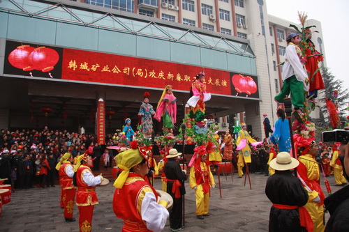 鑼鼓交響齊奏春之旋律,龍騰獅躍共抒發(fā)展豪情。2月10日,韓城礦業(yè)公司(韓城礦務(wù)局)機(jī)關(guān)大院彩綢飄飄,人頭攢動(dòng),鑼鼓喧天,鞭炮齊鳴。公司(局)所屬的桑樹(shù)坪礦、下峪口礦、生活服務(wù)中心、象山礦井組織的2011年新春大型社火表演在這里隆重舉行。他們把公司機(jī)關(guān)辦公樓附近家屬區(qū)和村莊新春氣氛渲染得紅紅火火,熱熱鬧鬧。