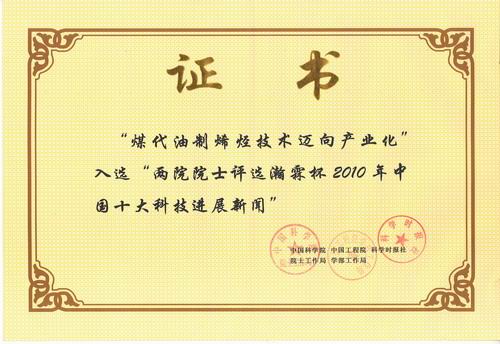 由中國科學院院士工作局、中國工程院學部工作局和科學時報社共同主辦,557名中國科學院院士和中國工程院院士投票評選,瀚霖杯2010年中國十大科技進展新聞和世界十大科技進展新聞,2011年1月19日在北京揭曉。陜西煤業(yè)化工集團有限責任公司“煤代油制烯烴技術邁向產業(yè)化”光榮入選2010年中國十大科技進展新聞。