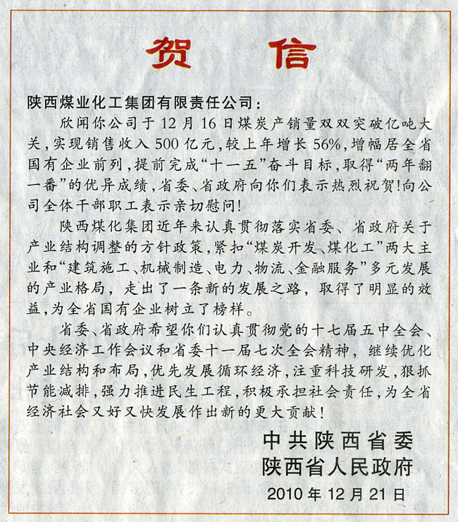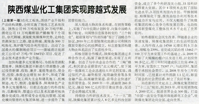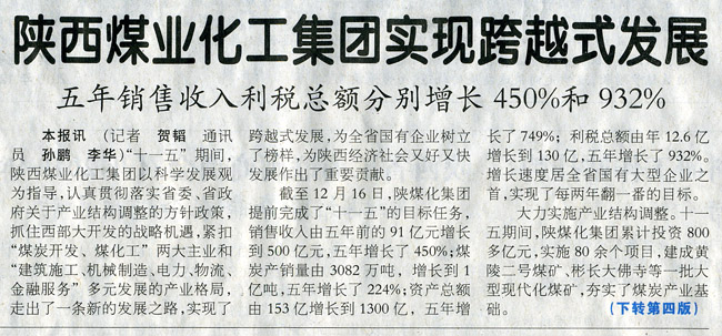 繼12月17日,陜西日?qǐng)?bào)一版報(bào)眼發(fā)表《陜煤化集團(tuán)煤炭產(chǎn)銷雙雙突破億噸大關(guān)——實(shí)現(xiàn)銷售收入500億,增幅居全省國(guó)企前列》報(bào)道之后,今日,陜西日?qǐng)?bào)再次在一版顯著位置發(fā)表《陜西煤業(yè)化工集團(tuán)實(shí)現(xiàn)跨越式發(fā)展——五年銷售收入利稅總額分別增長(zhǎng)450%和932%》,和中共陜西省委、陜西省人民政府祝賀陜西煤業(yè)化工集團(tuán)實(shí)現(xiàn)“十一五”奮斗目標(biāo)的賀信,并在該報(bào)20-21通版以《實(shí)現(xiàn)跨越發(fā)展 成就輝煌篇章——陜西煤業(yè)化工集團(tuán)“十一五”十大工作亮點(diǎn)回眸》進(jìn)行了深度報(bào)道。