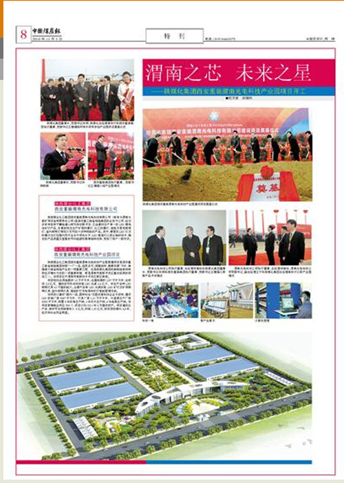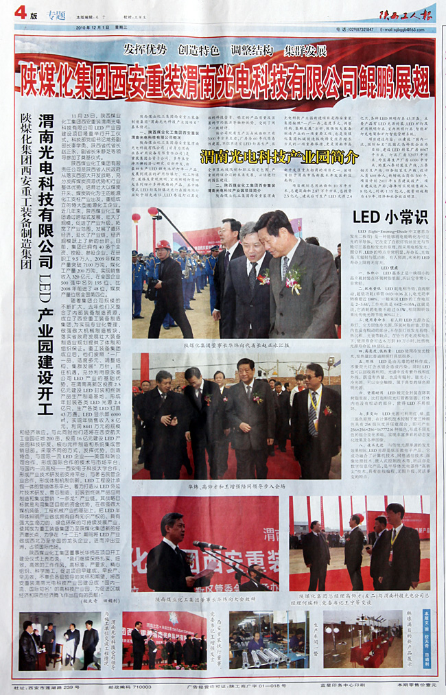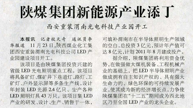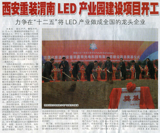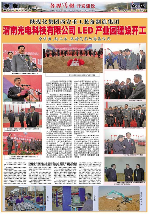 11月23日正式開工建設(shè)的陜煤化集團西安重裝渭南光電科技有限公司LED產(chǎn)業(yè)園建設(shè)項目,備受各大媒體關(guān)注。陜西日報、中國煤炭報、陜西工人報、各界導(dǎo)報等都進行了報道,其中,中國煤炭報以《陜煤集團新能源產(chǎn)業(yè)添丁——西安重裝渭南光電科技產(chǎn)業(yè)園開工》進行了報道、陜西工人報以《西安重裝渭南LED產(chǎn)業(yè)園建設(shè)項目開工——力爭在“十二五”將LED產(chǎn)業(yè)做成全國的龍頭企業(yè)》進行了消息報道,并同時進行了專題報道。各大媒體的關(guān)注,顯示出該項目以其高科技含量、綠色環(huán)保和可持續(xù)發(fā)展將成為新的經(jīng)濟增長點和陜煤化集團的新亮點。