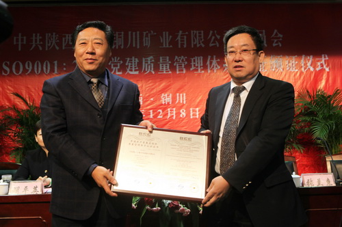 歷經(jīng)8 個(gè)月的工作,于12月8日上午,銅川礦業(yè)有限公司委員會(huì)黨建工作質(zhì)量管理體系順利通過(guò)了北京新世紀(jì)認(rèn)證有限公司現(xiàn)場(chǎng)審定,并取得認(rèn)證書(shū)。這是陜西省國(guó)有企業(yè)首家取得ISO9000質(zhì)量管理體系認(rèn)證的單位。省國(guó)資委黨委副書(shū)記、紀(jì)委書(shū)記高新華,陜煤化集團(tuán)黨委副書(shū)記馬富元、黨群工作部部長(zhǎng)夏迎廣及銅川市和銅川礦業(yè)公司相關(guān)領(lǐng)導(dǎo)和人員共160余人參加了認(rèn)證頒證儀式。銅川礦業(yè)公司黨委書(shū)記杜樹(shù)山主持認(rèn)證頒證儀式。