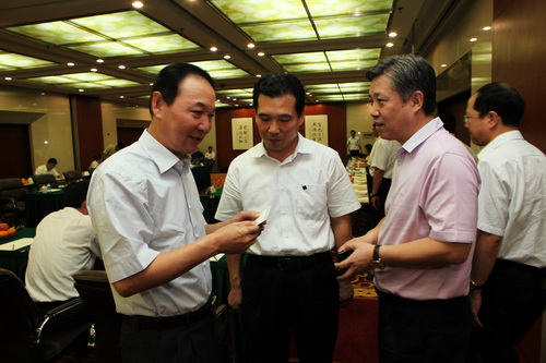 陜煤化集團(tuán)董事長(zhǎng)華煒與呂梁市副市長(zhǎng)張中生(左一)、山西焦煤集團(tuán)董事長(zhǎng)白培中(圖中)交談