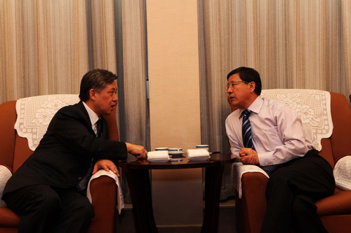 吳登昌副省長(zhǎng)(右一)在簽約儀式前會(huì)見陜煤化集團(tuán)董事長(zhǎng)華煒