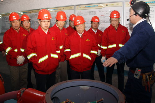 在黃陵礦業(yè)集團(tuán)公司總經(jīng)理宋老虎(左三)、黨委書記閆勃(右三)等陪同下,中煤政研會會長田淮?。ㄗ笏模㈩檰栺R德慶(右四)、副秘書長李演珍(右二)、徐騰生處長(左一)在一號煤礦井下實訓(xùn)基地觀看雙述表演、專業(yè)功力和作業(yè)功夫演練。