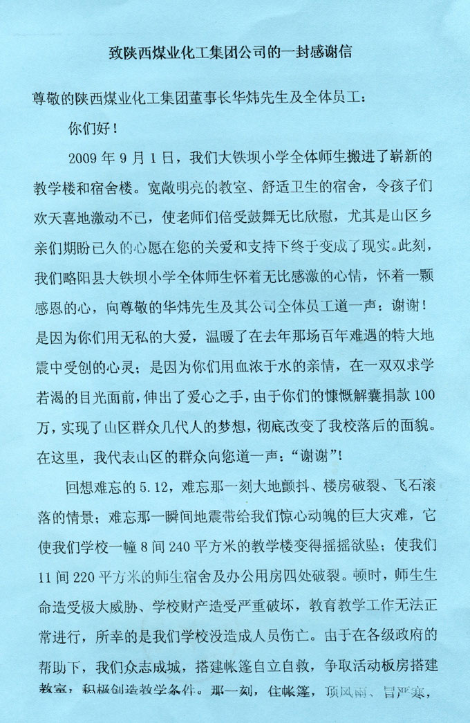 感謝信中寫到,去年5?12四川汶川特大地震中,大鐵壩小學(xué)一幢8間240平方米的教學(xué)樓變得搖搖欲墜,11間220平方米的師生宿舍及辦公用房四處破裂。災(zāi)后,學(xué)校搭建帳篷自立自救,爭取活動板房搭建教室,開始頂風(fēng)雨、冒嚴(yán)寒,師生同舟共濟(jì),克服困難恢復(fù)上課。就在這時(shí),陜西煤業(yè)化工集團(tuán)公司黨委書記、董事長華煒一行在余震不斷的情況下,不畏路途艱辛、不顧個(gè)人安危,親臨學(xué)校了解災(zāi)情、看望孩子、并慷慨解囊,援助該校重建。目前,一幢12間三層1220平方米的教學(xué)綜合樓、四間三層360平方米的學(xué)生宿舍樓拔地而起。此工程經(jīng)城建局科學(xué)設(shè)計(jì),采用框架式結(jié)構(gòu)建造,完全符合抗八級地震的要求。經(jīng)2009年8月26日驗(yàn)收合格,9月1日正式投入使用。新建成的教學(xué)樓滿足了全校7個(gè)教學(xué)班186名學(xué)生11名教師的學(xué)習(xí)、工作和生活。極大地改善了學(xué)校的教學(xué)條件,進(jìn)一步縮小了城鄉(xiāng)教育環(huán)境的差距,更加堅(jiān)定了教師們扎根農(nóng)村基層教育第一線的決心和信心。感謝信最后,飽含感恩之心寫到:“你們這一壯舉,將永遠(yuǎn)載入我校史冊,受后人敬仰。”