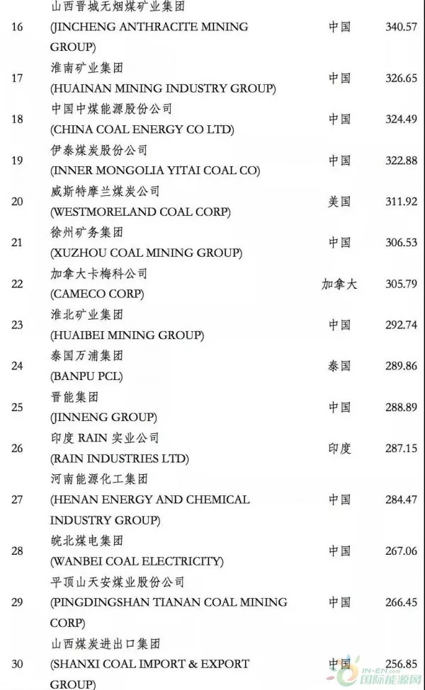 煤炭企業(yè)全球競爭力排行榜 30 強(qiáng)