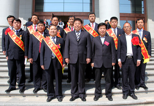 陜煤集團(tuán)總經(jīng)理嚴(yán)廣勞、工會(huì)主席李向東與集團(tuán)公司獲獎(jiǎng)代表合影