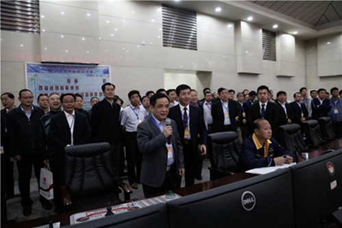 與會人員深入一號煤礦參觀了核算中心和物資超市,詳細了解了智能化無人開采技術的推廣應用情況。在地面指揮控制中心,中國工程院院士張鐵崗通過操作平臺遠程操控,一鍵開啟了采煤機,中國工程院院士彭蘇萍與井下當班隊長進行了實時通話,與會人員通過監(jiān)控大屏觀看了工作面噴霧開啟、滾筒轉動采煤、刮板運輸機運煤的全過程。