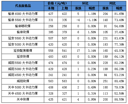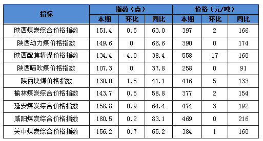 其中分品種:動力煤指數(shù)149.6點,較上期持平;配焦精煤指數(shù)134.4點,較上期上漲4.0點;噴吹煤指數(shù)107.3點,較上期持平;塊煤指數(shù)130.0點,較上期上漲1.5點;分區(qū)域:榆林指數(shù)143.7點,較上期上漲0.5點;延安指數(shù)158.8點,較上期上漲0.9點;咸陽指數(shù)180.5點,較上期上漲0.2點;關(guān)中指數(shù)156.2點,較上期上漲0.7點。