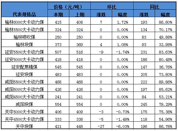 表2:陜西煤炭代表規(guī)格品價格