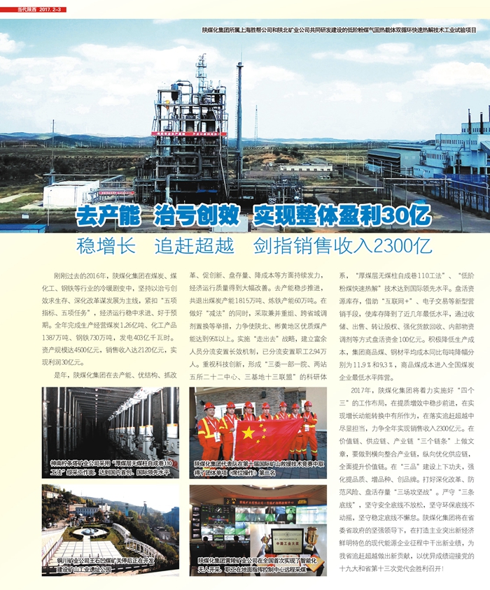 2016年,陜煤化集團在去產(chǎn)能、優(yōu)結構、抓改革、促創(chuàng)新、盤存量、降成本等方面持續(xù)發(fā)力,經(jīng)濟運行質量得到大幅改善。去產(chǎn)能穩(wěn)步推進,共退出煤炭產(chǎn)能1815萬噸、煉鐵產(chǎn)能60萬噸。在做好“減法”的同時,采取兼并重組、跨省域調(diào)劑置換等舉措,力爭使陜北、彬黃地區(qū)優(yōu)質煤產(chǎn)能達到95%以上。實施“走出去”戰(zhàn)略,建立富余人員分流安置長效機制,已分流安置職工2.94萬人。重視科技創(chuàng)新,形成“三委一部一院、兩站五所二十二中心、三基地十三聯(lián)盟”的科研體系,“厚煤層無煤柱自成巷110工法”、“低階粉煤快速熱解”技術達到國際領先水平。盤活資源庫存,借助“互聯(lián)網(wǎng)+”、電子交易等新型營銷手段,使庫存降到了近幾年最低水平,通過收儲、出售、轉讓股權、強化貨款回收、內(nèi)部物資調(diào)劑等方式盤活資金100億元。積極降低生產(chǎn)成本,集團商品煤、鋼材平均成本同比每噸降幅分別為11.9%和9.3%,商品煤成本進入全國煤炭企業(yè)最低水平陣營。