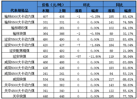 表2:陜西煤炭代表規(guī)格品價格