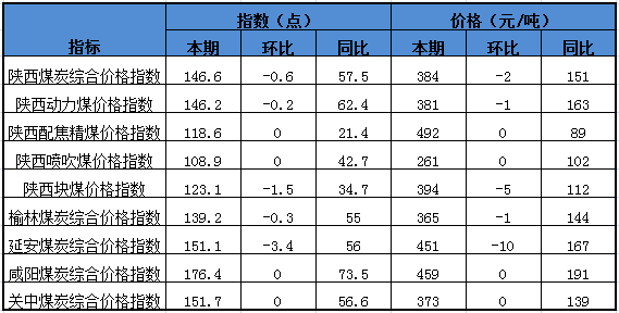 2016年12月16日陜西煤炭綜合價格指數為146.6點,環(huán)比上期下跌0.6點,同比上漲57.5點,對應陜西煤炭綜合價格384元/噸,環(huán)比上期下跌2元/噸,同比上漲151元/噸。其中分品種:動力煤指數146.2點,較上期下跌0.2點;配焦精煤指數118.6點,較上期持平;噴吹煤指數108.9點,較上期持平;塊煤指123.1點,較上期下跌1.5點;分區(qū)域:榆林指數139.2點,較上期下跌0.3點;延安指數151.1點,較上期下降3.4點;咸陽指數176.4點,較上期持平;關中指數151.7點,較上期持平。