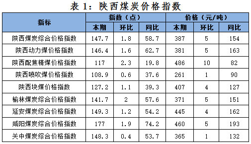 二、本期市場(chǎng)分析2016年11月18日陜西煤炭綜合價(jià)格指數(shù)為147.7點(diǎn),環(huán)比上期上漲1.8點(diǎn),同比上漲58.7點(diǎn),對(duì)應(yīng)陜西煤炭綜合價(jià)格387元/噸,環(huán)比上期上漲5元/噸,同比上漲154元/噸。其中分品種:動(dòng)力煤指數(shù)146.4點(diǎn),較上期上漲1.6點(diǎn);配焦精煤指數(shù)117點(diǎn),較上期上漲2.3點(diǎn);噴吹煤指數(shù)108.9點(diǎn),較上期上漲0.6點(diǎn);塊煤指數(shù)127.2點(diǎn),較上期上漲1.1點(diǎn);分區(qū)域:榆林指數(shù)141.7點(diǎn),較上期上漲2點(diǎn);延安指數(shù)149.3點(diǎn),較上期上漲1.2點(diǎn);咸陽指數(shù)177點(diǎn),較上期上漲1.9點(diǎn);關(guān)中指數(shù)148.3點(diǎn),較上期上漲0.4點(diǎn)。