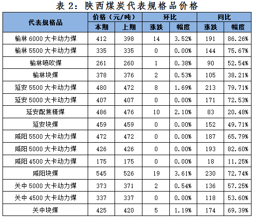 本周陜西綜合價(jià)格指數(shù)小幅上漲,漲幅繼續(xù)收窄。從品種指數(shù)來看,動(dòng)力煤指數(shù)、噴吹煤指數(shù)、配焦精煤指數(shù)和塊煤指數(shù)均小幅上漲;從區(qū)域指數(shù)來看,陜西省內(nèi)四個(gè)主要產(chǎn)煤區(qū)價(jià)格指數(shù)均有不同程度上漲,漲幅較前期收窄;從代表規(guī)格品數(shù)據(jù)來看,本期陜西煤炭價(jià)格指數(shù)監(jiān)測(cè)15個(gè)代表規(guī)格品中8個(gè)上漲,7個(gè)持平,漲幅最大為3.61%,價(jià)格不變代表規(guī)格品明顯增加。