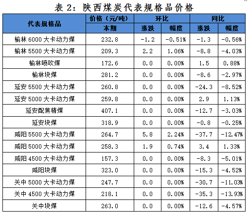 延安地區(qū),本周市場(chǎng)情況趨于穩(wěn)定,交易量略有下滑,價(jià)格保持穩(wěn)定。從監(jiān)測(cè)價(jià)格情況看:Q5500動(dòng)力煤均價(jià)260.8元/噸,較上期持平;Q5000動(dòng)力煤均價(jià)259.8元/噸,較上期上升3.5元/噸;塊煤均價(jià)318.9元/噸,較上期持平。