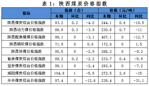 二、本期市場(chǎng)分析2016年7月29日陜西煤炭綜合價(jià)格指數(shù)為93.2點(diǎn),環(huán)比上期上漲0.2點(diǎn),同比下跌4.0點(diǎn),對(duì)應(yīng)陜西煤炭綜合價(jià)格244.1元/噸,環(huán)比上期上漲0.6元/噸,同比下跌10.5元/噸。其中分品種:動(dòng)力煤指數(shù)88.9點(diǎn),較上期上漲0.3點(diǎn);配焦精煤指數(shù)98.1點(diǎn),較上期持平;噴吹煤指數(shù)71.9點(diǎn),較上期持平;塊煤指數(shù)90.5點(diǎn),較上期持平;分區(qū)域:榆林指數(shù)89.2點(diǎn),較上期上漲0.2點(diǎn);延安指數(shù)98.1,較上期持平;咸陽(yáng)指數(shù)104.8點(diǎn),較上期上漲1.0點(diǎn);關(guān)中指數(shù)97.4點(diǎn),較上期持平。
