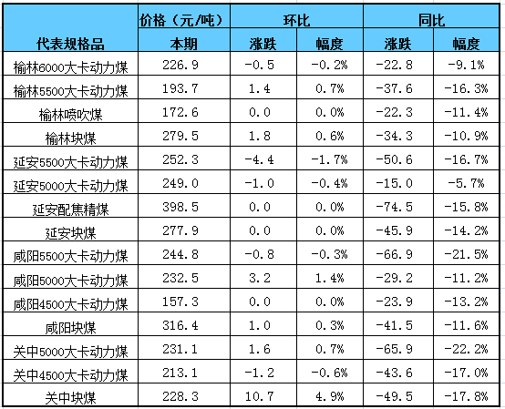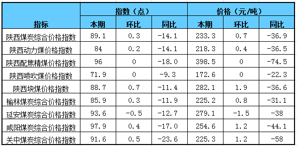 一、本期陜西煤炭?jī)r(jià)格指數(shù)及代表規(guī)格品價(jià)格情況