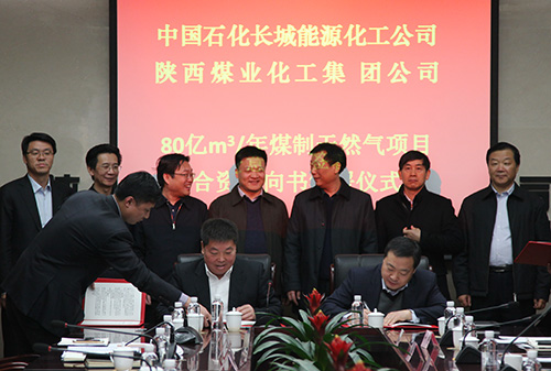 2月24日上午,陜西煤業(yè)化工集團公司與中國石化長城能源化工公司在西安舉行80億m3/年煤制天然氣項目合資意向書簽署儀式暨項目推進座談會。陜西省能源局副局長王東,中石化長城能源化工公司總經(jīng)理楊棟、副總經(jīng)理何祚云、曹維鶴及有關(guān)部門負責(zé)人,中石化西安分公司總經(jīng)理李少平、書記曹西平、副總經(jīng)理王先鋒,陜煤化集團總經(jīng)理嚴廣勞,常務(wù)副總經(jīng)理尤西蒂,副總經(jīng)理尚建選、孫喜民及總經(jīng)理助理楊新民和有關(guān)部門負責(zé)人等出席會議。