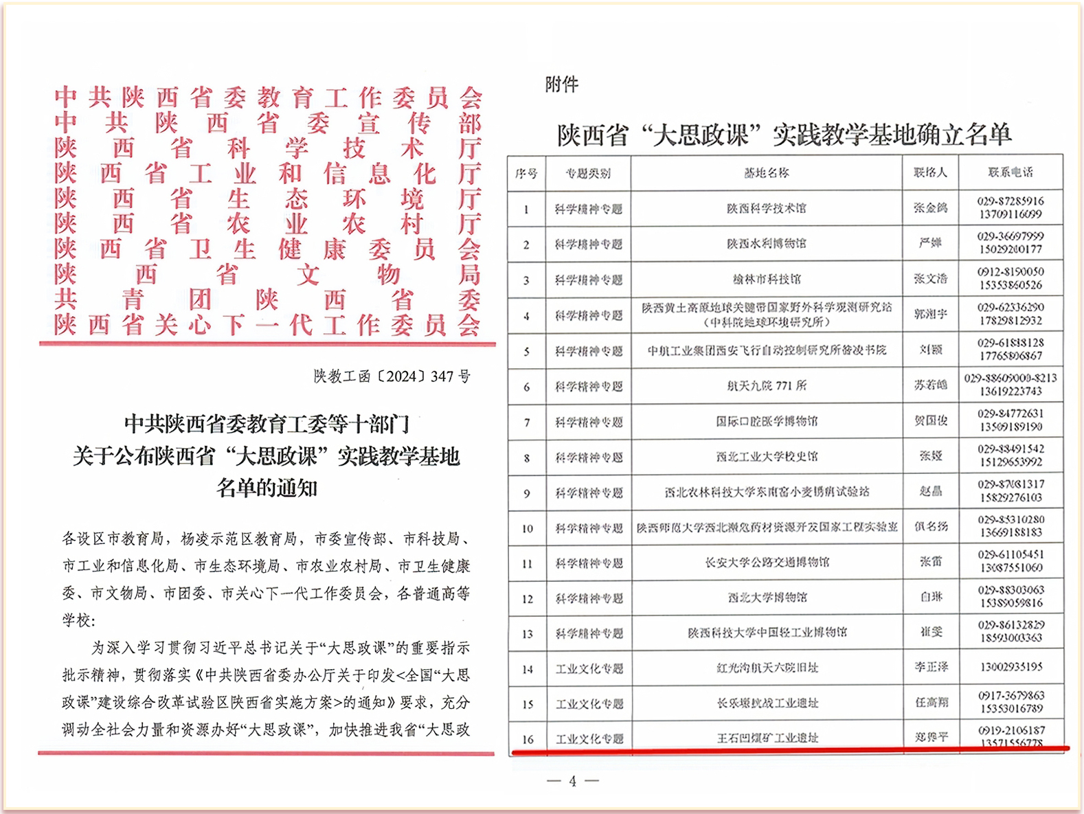 為深入學習貫徹習近平總書記關于“大思政課”的重要指示批示精神,貫徹落實《中共陜西省委辦公廳關于印發(fā)<全國“大思政課”建設綜合改革試驗區(qū)陜西省實施方案>的通知》要求,充分調(diào)動全社會力量和資源辦好“大思政課”,加快推進我省“大思政課”綜合改革試驗區(qū)建設,中共陜西省委教育工委等十部門聯(lián)合確立了一批省級“大思政課”實踐教學基地。在確立的86家基地中,共有7家單位榮獲工業(yè)文化專題實踐教學基地,王石凹煤礦工業(yè)遺址名列其中。