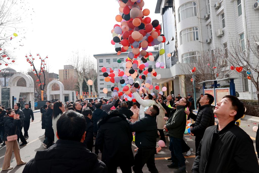 在“踩氣球”環(huán)節(jié),隨著掛于機(jī)關(guān)院的五彩氣球落下,瞬時點(diǎn)燃了活動的熱潮,大家紛紛跑進(jìn)氣球掉落區(qū)域用力踩腳氣球,“幸運(yùn)者”還獲得了氣球里放置的獎品,為新年新的開始贏得“好彩頭”。