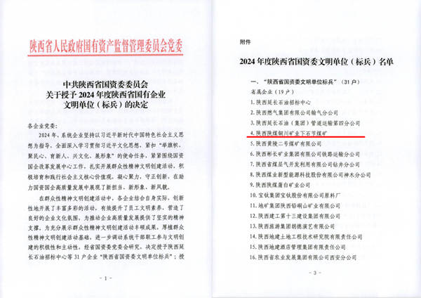 近日,陜西省國資委公布了2024 年度文明單位(標(biāo)兵)名單,下石節(jié)礦榮獲 “陜西省國有企業(yè)文明單位標(biāo)兵” 稱號。