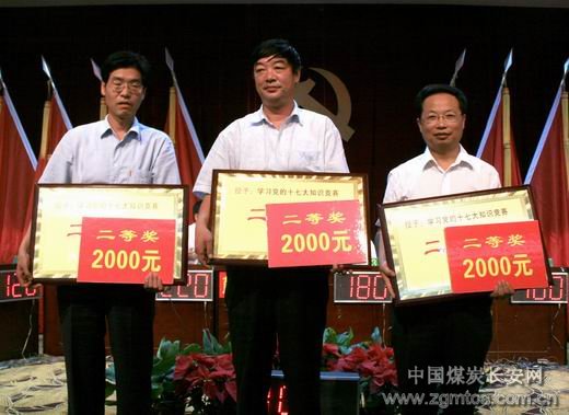 主持人提問,參賽隊(duì)員們積極回答,一問一答,險(xiǎn)象環(huán)生,有對答如流,有磕磕絆絆,有放棄回答,可臺下的掌聲卻在一直支持隊(duì)員們。真是臺上異彩紛呈,臺下掌聲陣陣。王石凹礦隊(duì)員一口氣回答了十六大以來我國取得十個(gè)方面的巨大成就,贏來了熱烈的掌聲;仲裁委員會(huì)成員一句“犯規(guī),扣十分”顯示了競賽的嚴(yán)肅性和公正性;華瑞公司的女參賽選手劉晉更是給大家留下了深刻的印象,她流利的對答,稔熟的背誦,讓人不得不佩服她的聰慧和記憶力,也體會(huì)到那句話:臺上一分鐘,臺下十年功啊。在緊張的競賽之間,主持人為在座的朋友們提出問題,大家踴躍參與,使會(huì)場的氣氛熱烈而充滿活力。比賽在緊張進(jìn)行著,此時(shí),三個(gè)單位的分?jǐn)?shù)一樣了,決定勝負(fù)的關(guān)鍵時(shí)刻到了,比賽進(jìn)入最后的挑戰(zhàn),搶答題決勝負(fù)。功夫不負(fù)有心人,華瑞公司的劉晉以流暢的回答為單位贏得了最關(guān)鍵的20分,華瑞公司奪冠。如潮的掌聲伴隨著喝彩在大廳里響起,經(jīng)久不息。
