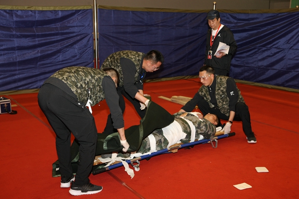 室外競賽激烈角逐,位于銅川礦業(yè)公司礦山救護大隊綜合訓練館內的醫(yī)療綜合體能競賽中也精彩紛呈。競賽中醫(yī)療救護各參賽隊隊員緊張忙碌地進行著傷員心肺復蘇及創(chuàng)傷急救,止血、包扎、固定、搬運等各個動作相互銜接、標準到位、忙而不亂、緊湊有序,既充分展示了日常訓練和實戰(zhàn)歷練的技術素養(yǎng),又有效檢驗了醫(yī)療救援隊伍的業(yè)務技能和綜合素質。