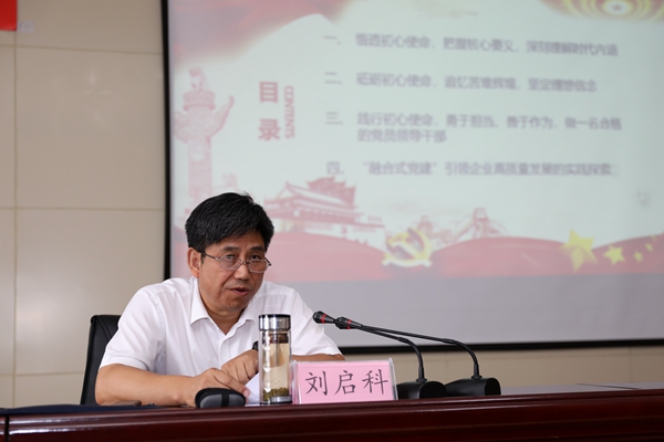開班儀式結(jié)束后,劉啟科以《砥礪初心、勇?lián)姑窞轭},從“悟透初心使命,把握核心要義,深刻理解時(shí)代內(nèi)涵;砥礪初心使命,追憶苦難輝煌,堅(jiān)定理想信念;踐行初心使命,勇于擔(dān)當(dāng)、善于作為,做一名合格的黨員領(lǐng)導(dǎo)干部;融合式黨建引領(lǐng)企業(yè)高質(zhì)量發(fā)展的實(shí)踐探索”五個(gè)方面,結(jié)合自己工作實(shí)際,通過(guò)詳實(shí)生動(dòng)的案例,為學(xué)員帶來(lái)了一堂精彩的專題黨課。