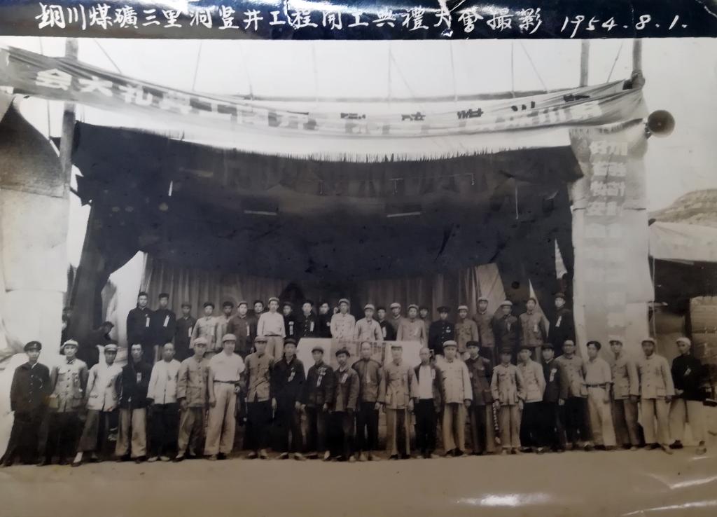 1954年8月1號,銅川三里洞礦井開建,王長雨(后排左第八個(gè))參加開工典禮
