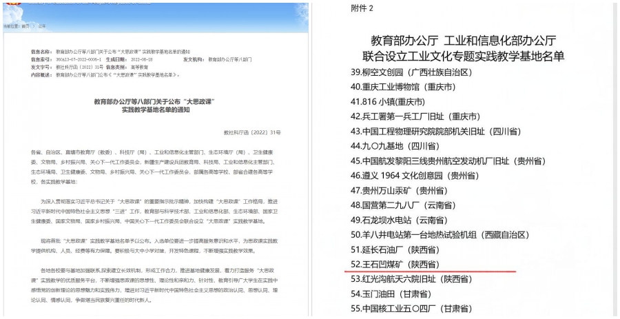 為深入貫徹習(xí)近平總書記關(guān)于“大思政課”的重要指示批示精神,加快構(gòu)建“大思政課”工作格局,推進習(xí)近平新時代中國特色社會主義思想“三進”工作,教育部與科學(xué)技術(shù)部、工業(yè)和信息化部、生態(tài)環(huán)境部、國家衛(wèi)生健康委、國家文物局、國家鄉(xiāng)村振興局、中國關(guān)心下一代工作委員會聯(lián)合設(shè)立“大思政課”實踐教學(xué)基地,并于近日公布首批453家“大思政課”實踐教學(xué)基地名單。在這些基地中,全國煤炭行業(yè)共有6家涉煤單位榮獲工業(yè)文化專題實踐教學(xué)基地,公司王石凹煤礦名列其中。