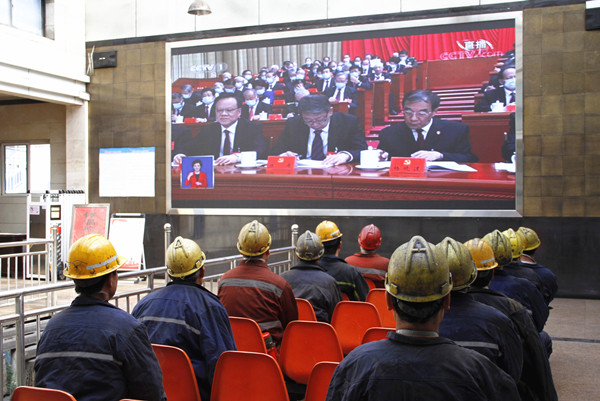 公司黨委書記、董事長劉水利與柴家溝井黨員干部一起收看大會開幕盛況