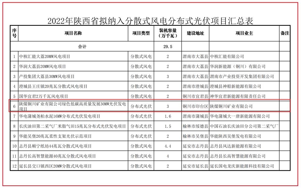 11月24日,公司50MWp光伏發(fā)電項目通過陜西省發(fā)改委光伏發(fā)電項目保障性并網(wǎng)規(guī)模競爭性配置評審,正式獲得批準。此項目為2022年陜煤集團所屬企業(yè)中,唯一通過省競爭性配置評審獲批的分布式光伏發(fā)電項目,標志著公司在實現(xiàn)碳達峰、碳中和,加快推進綠色低碳技術攻關和應用,踐行生態(tài)文明理念、推進實現(xiàn)生態(tài)環(huán)境保護和企業(yè)高質(zhì)量發(fā)展邁出堅實的一步。