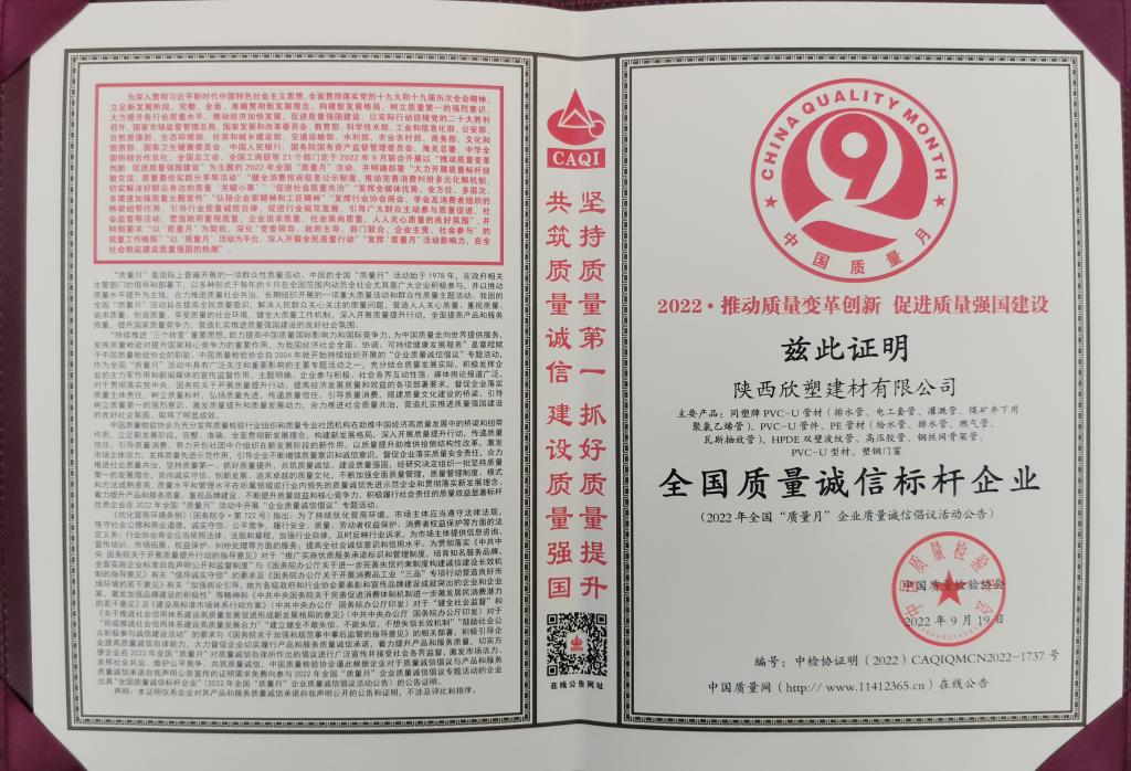 “硬質(zhì)量才能鍛造好品牌”。該公司把卓越績(jī)效、精益管理融入生產(chǎn)各個(gè)環(huán)節(jié),扎實(shí)開展QC活動(dòng)、“標(biāo)準(zhǔn)化+”“質(zhì)量衛(wèi)士”和“質(zhì)量先鋒”創(chuàng)建等系列質(zhì)量提升行動(dòng),抓好工藝優(yōu)化、配方試驗(yàn),并有獎(jiǎng)?wù)骷瘑T工對(duì)質(zhì)量管控、設(shè)備技改、提質(zhì)提效等方面的合理化建議,持續(xù)改進(jìn)產(chǎn)品質(zhì)量,PE鋼絲網(wǎng)骨架管、高壓膠管、HDPE波紋管、PE給水管、PVC排水管、塑鋼門窗等產(chǎn)品的關(guān)鍵指標(biāo)優(yōu)于國(guó)家標(biāo)準(zhǔn),處于行業(yè)先進(jìn)水平。同時(shí),以用戶需求為導(dǎo)向,技術(shù)創(chuàng)新為驅(qū)動(dòng),加大技術(shù)研發(fā)投入,推動(dòng)成果轉(zhuǎn)化運(yùn)用,獲得《一種便于法蘭盤定位的鋼絲網(wǎng)骨架管》《一種具有防止接頭斷裂的高壓膠管》等實(shí)用新型專利21項(xiàng),全面提升用戶滿意度。該公司以過硬的產(chǎn)品質(zhì)量和優(yōu)良的售后服務(wù),打造了“同塑”優(yōu)質(zhì)品牌。企業(yè)榮獲“銅川質(zhì)量獎(jiǎng)”“全國(guó)質(zhì)量誠(chéng)信標(biāo)桿企業(yè)”“全國(guó)產(chǎn)品和服務(wù)質(zhì)量誠(chéng)信示范企業(yè)”等榮譽(yù)。產(chǎn)品廣泛銷往河南、山西、榆林、延安、寶雞、西安、渭南等多個(gè)省市地區(qū)。2022年,該公司營(yíng)業(yè)收入較上年增幅達(dá)到了18.4%,再創(chuàng)歷史新高,助力企業(yè)超額完成了年度經(jīng)營(yíng)目標(biāo)任務(wù)。