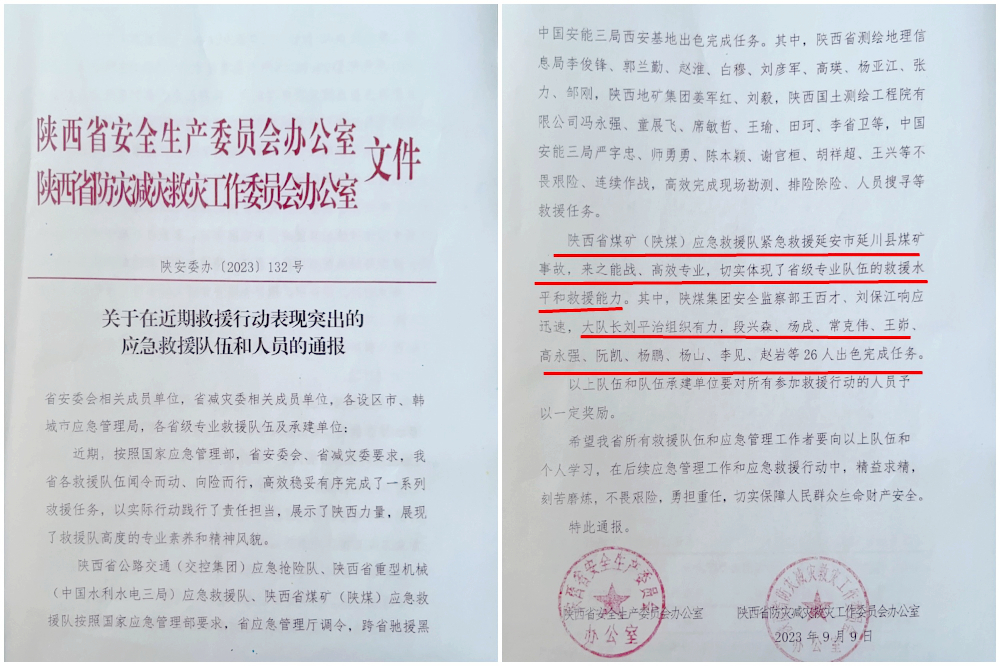 近日,陜西省安全生產(chǎn)委員會(huì)辦公室和陜西省防災(zāi)減災(zāi)救災(zāi)工作委員會(huì)辦公室聯(lián)合下發(fā)《關(guān)于在近期救援行動(dòng)表現(xiàn)突出的應(yīng)急救援隊(duì)伍和人員的通報(bào)》,對(duì)陜西省表現(xiàn)突出救援隊(duì)及指戰(zhàn)員進(jìn)行通報(bào)表彰,其中,公司救護(hù)大隊(duì)在此次通報(bào)表彰之列。