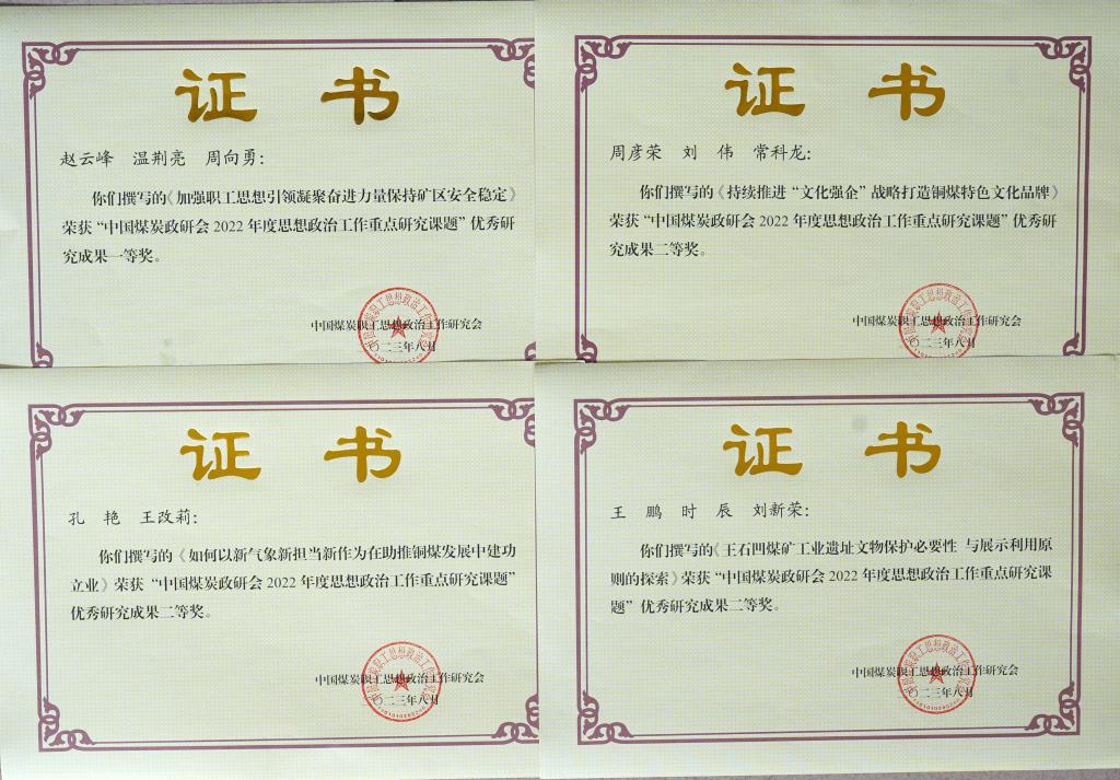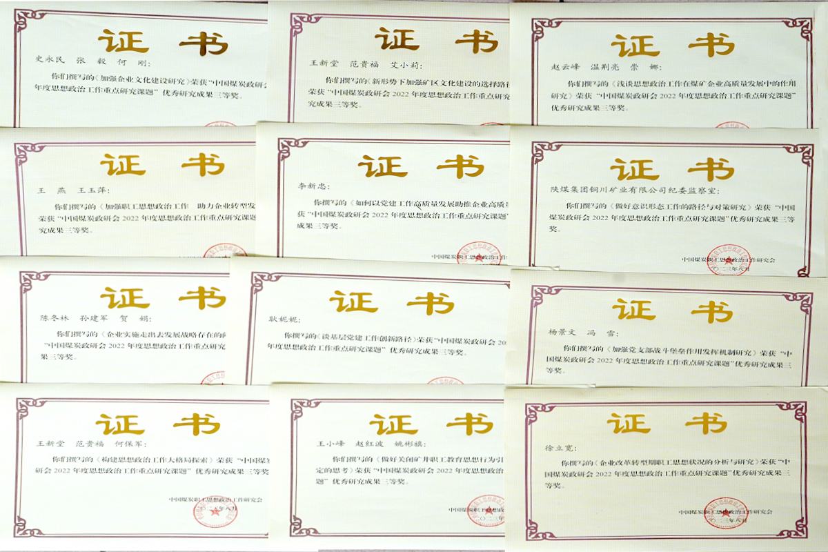 在本次受表彰的全煤系統(tǒng)思想政治工作重點(diǎn)研究課題成果發(fā)布會(huì)上,共有全煤行業(yè)的11家單位榮獲優(yōu)秀組織獎(jiǎng),其中公司是本次課題研究成果發(fā)布會(huì)上陜煤集團(tuán)所屬單位中唯一獲得優(yōu)秀組織獎(jiǎng)的集團(tuán)二級(jí)單位。在受表彰的全煤行業(yè)優(yōu)秀課題研究成果中,共有84項(xiàng)成果榮獲一等獎(jiǎng)、140項(xiàng)成果榮獲二等獎(jiǎng)、307項(xiàng)成果榮獲三等獎(jiǎng)。其中,公司5個(gè)黨群部門(mén)、3個(gè)礦井、6個(gè)生產(chǎn)輔助單位的33名作者撰寫(xiě)的16篇課題研究成果,榮獲一等獎(jiǎng)1篇、二等獎(jiǎng)3篇、三等獎(jiǎng)12篇,課題內(nèi)容涵蓋了黨建工作研究、企業(yè)文化建設(shè)、意識(shí)形態(tài)工作、群團(tuán)隊(duì)伍建設(shè)、深化改革創(chuàng)新、企業(yè)轉(zhuǎn)型發(fā)展、工業(yè)遺產(chǎn)保護(hù)利用等兼具理論指導(dǎo)和實(shí)踐價(jià)值的多項(xiàng)理論研究成果,一并受到了大會(huì)的表彰獎(jiǎng)勵(lì),并實(shí)現(xiàn)了獲獎(jiǎng)格次、數(shù)量和質(zhì)量的新突破。