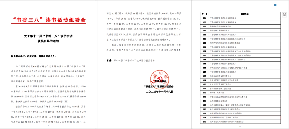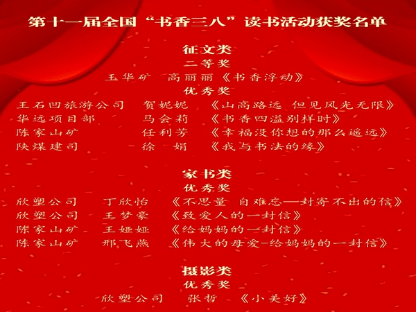 第十一屆“書香三八”讀書活動(dòng)以“閱讀新時(shí)代 鑄就新輝煌”為主題,由紅旗出版社、“書香三八”讀書活動(dòng)組委會(huì)共同舉辦,來自全國31個(gè)省市22000余家單位、1100多萬女性參與本屆讀書活動(dòng),陜煤集團(tuán)共40篇作品獲獎(jiǎng),其中公司有10篇作品榜上有名,分獲二等獎(jiǎng)1篇,優(yōu)秀獎(jiǎng)9篇。