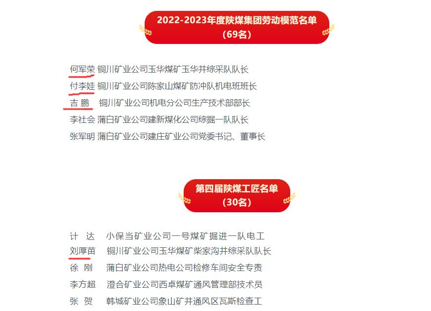 4月23日,陜煤集團(tuán)召開2022-2023年度文明單位暨勞動模范、陜煤工匠表彰大會,公司玉華煤礦被評為陜煤集團(tuán)文明單位,公司員工何軍榮、付李娃、吉鵬榮獲陜煤集團(tuán)勞動模范稱號,公司員工劉厚苗被授予第四屆陜煤工匠稱號。